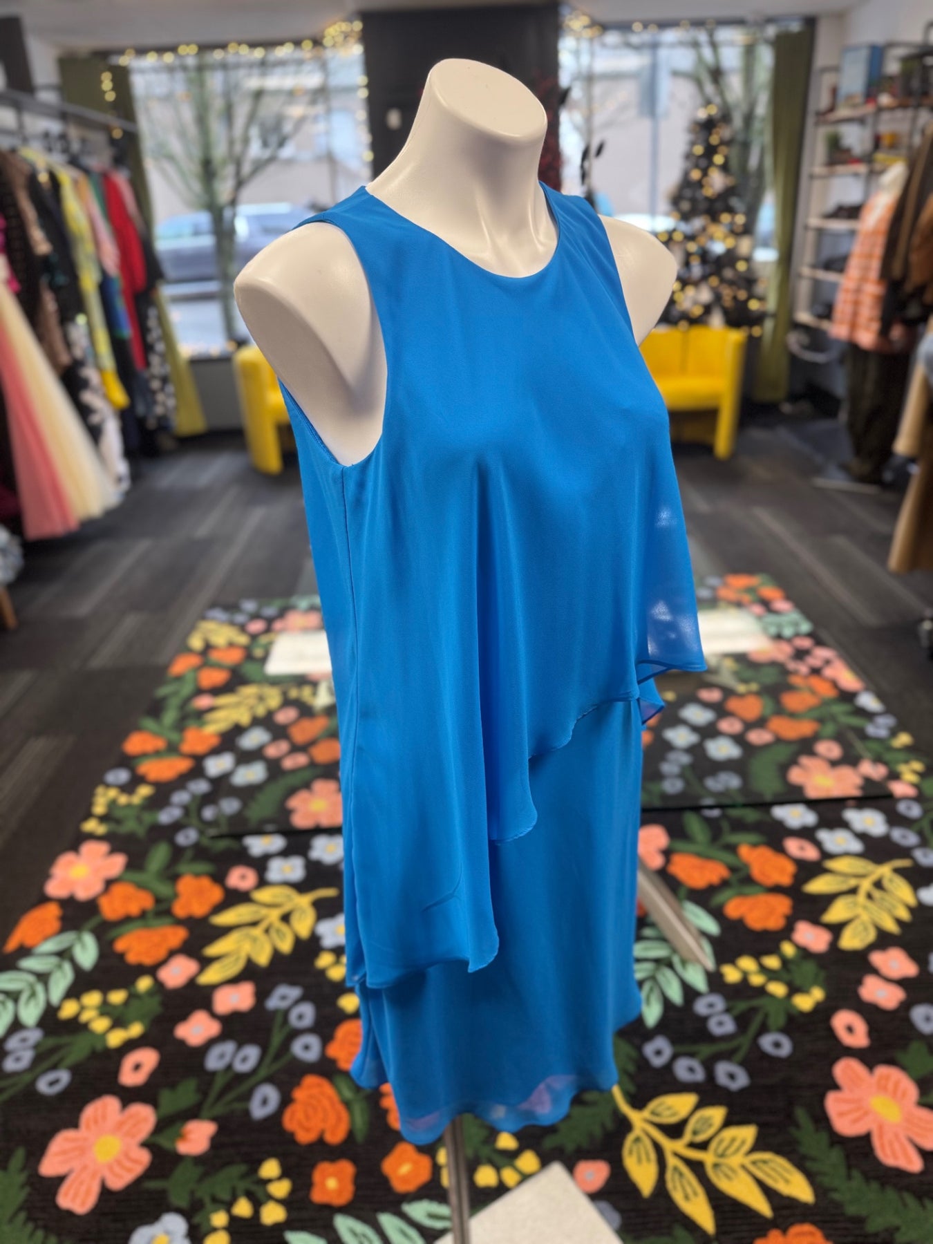 A vibrant blue sleeveless chiffon dress that exudes effortless elegance. Its layered detail adds a touch of femininity, making it perfect for summer events or casual outings. The flowy fabric ensures comfort without compromising style. This dress is a versatile addition to any wardrobe, offering a breezy yet polished look.