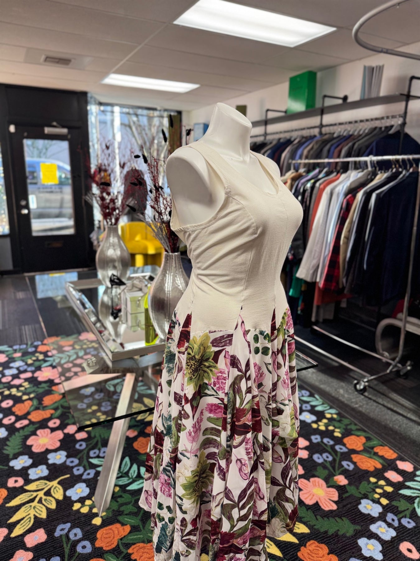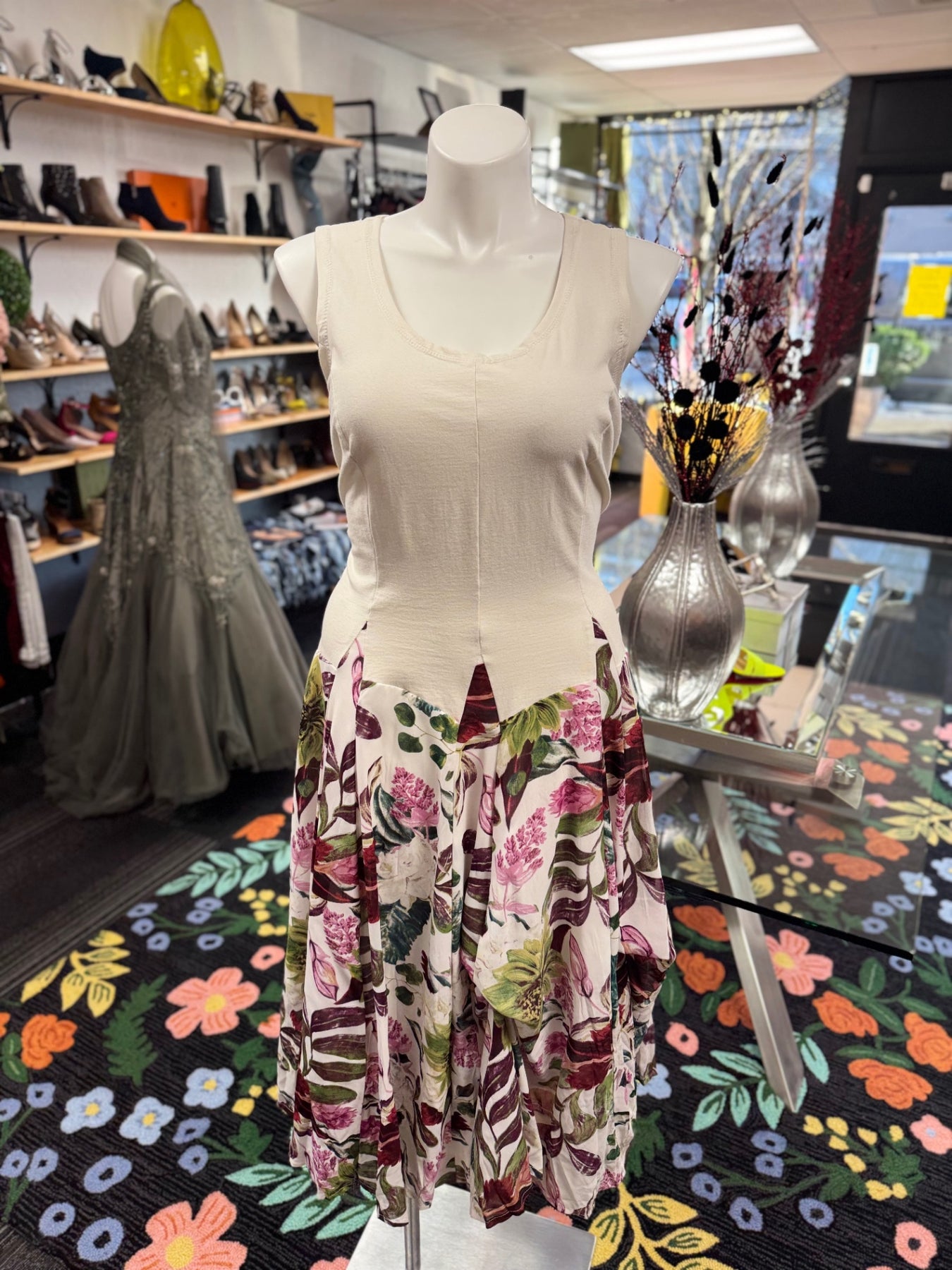 Elegant floral dress featuring a sleeveless cream top and a flowing skirt with vibrant botanical prints. Perfect for spring and summer occasions, this dress combines comfort with a sophisticated style. Its lightweight fabric ensures breathability, making it ideal for warm weather. The fitted top transitions into a full, pleated skirt that adds movement and grace. Ideal for garden parties, casual outings, or semi-formal events, this dress offers versatile wearability.