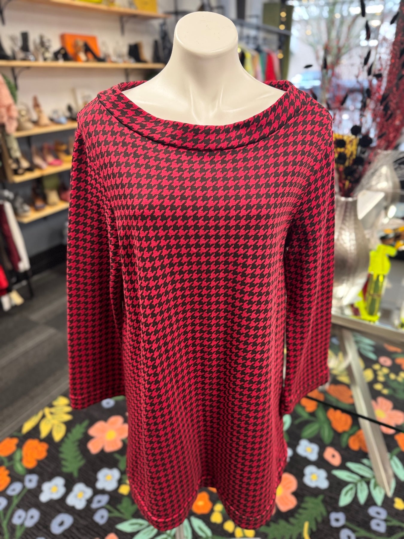 This stylish women's shirt features a bold red and black houndstooth pattern. Its loose fit and wide neckline make it a versatile piece for both casual and chic ensembles. The soft fabric ensures comfort while maintaining a fashionable look. Perfect for layering or wearing as a statement piece on its own.