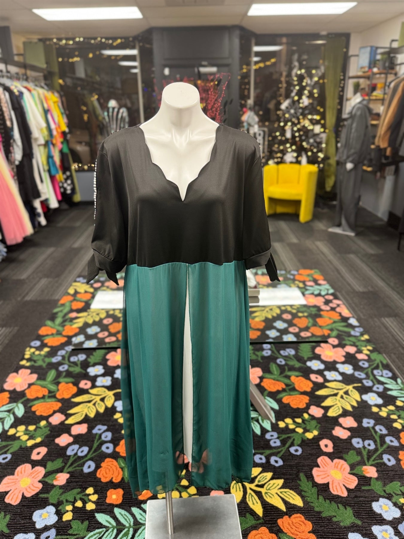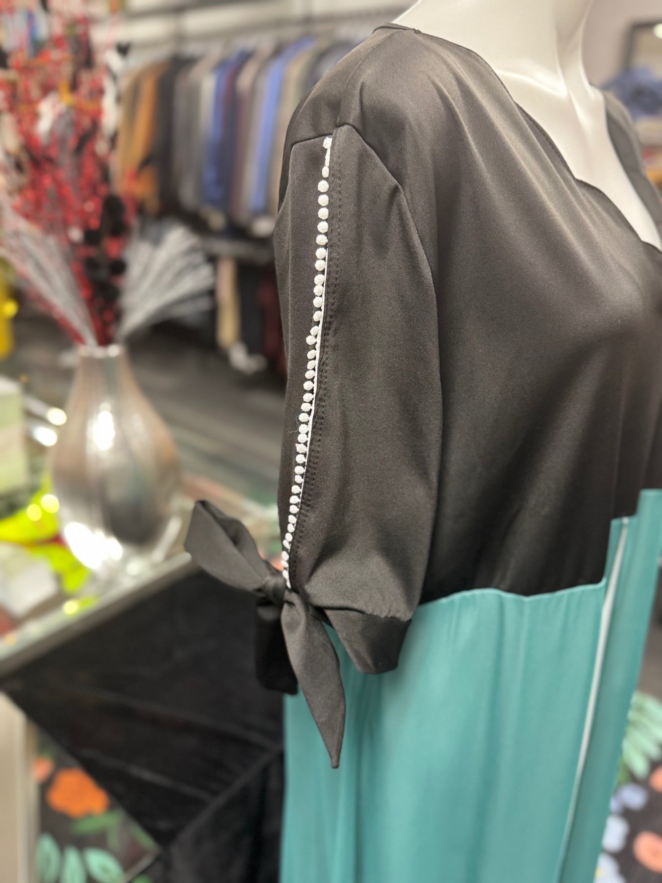 This elegant dress combines a sleek black satin top with flowing teal skirt. The scalloped neckline adds a delicate touch, while the long sleeves feature subtle tie details. Perfect for a sophisticated evening out or special occasion, this dress offers both comfort and style with its smooth, glossy finish and versatile design.