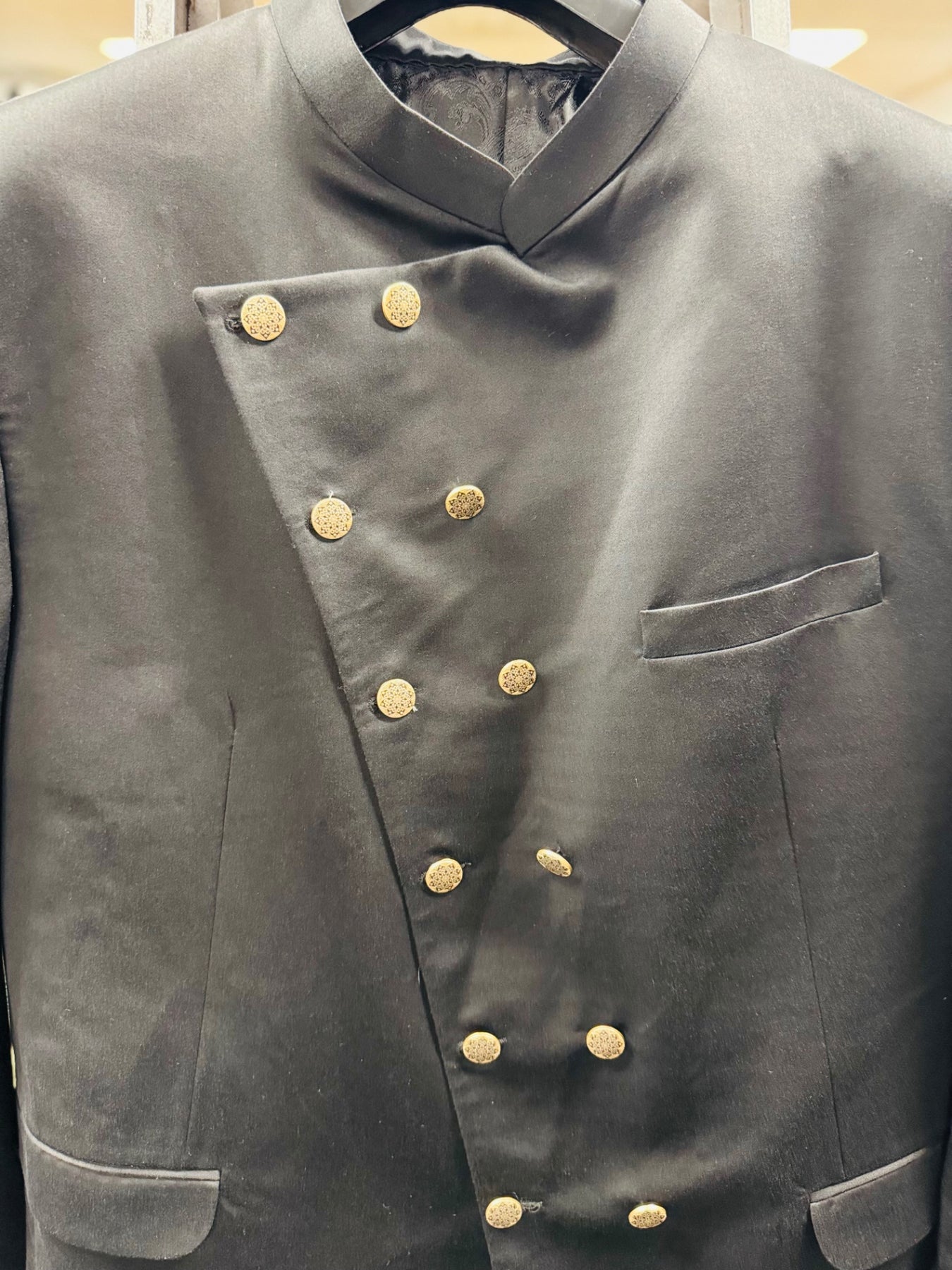 This stylish black men's blazer exudes classic elegance with its structured design. featuring gold buttons and a sleek lapel, it's perfect for formal occasions or a sharp business look. The tailored fit enhances any silhouette, making it a versatile addition to your wardrobe.
