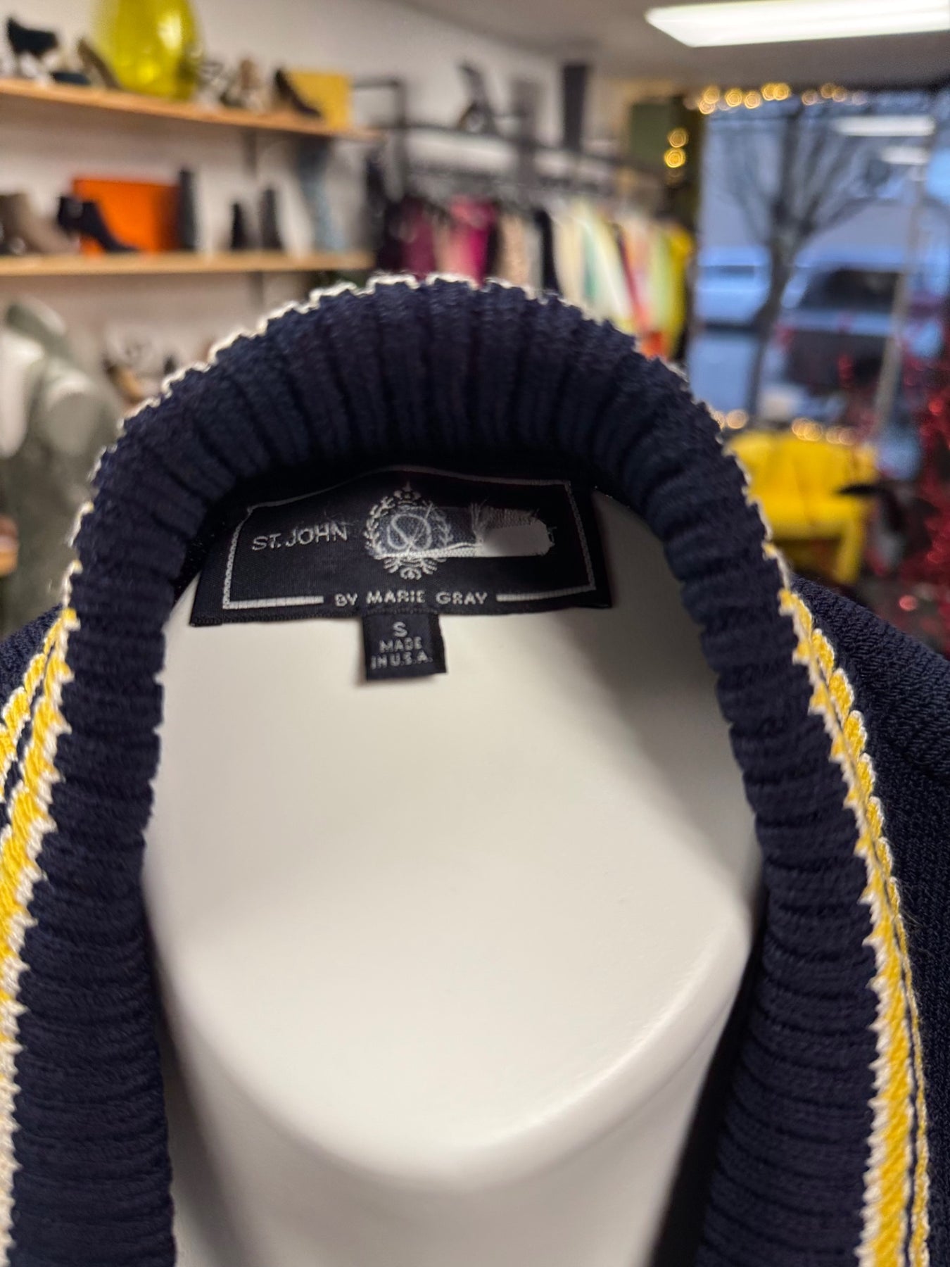 A classic navy blue women's coat from St. John by Marie Gray. Crafted from a textured knitted fabric, it features a zip-up front and striped yellow and white collar and cuffs for a sporty touch. The fitted silhouette makes it a versatile piece for casual or semi-formal wear. Perfect for cooler days when you need warmth and style.
