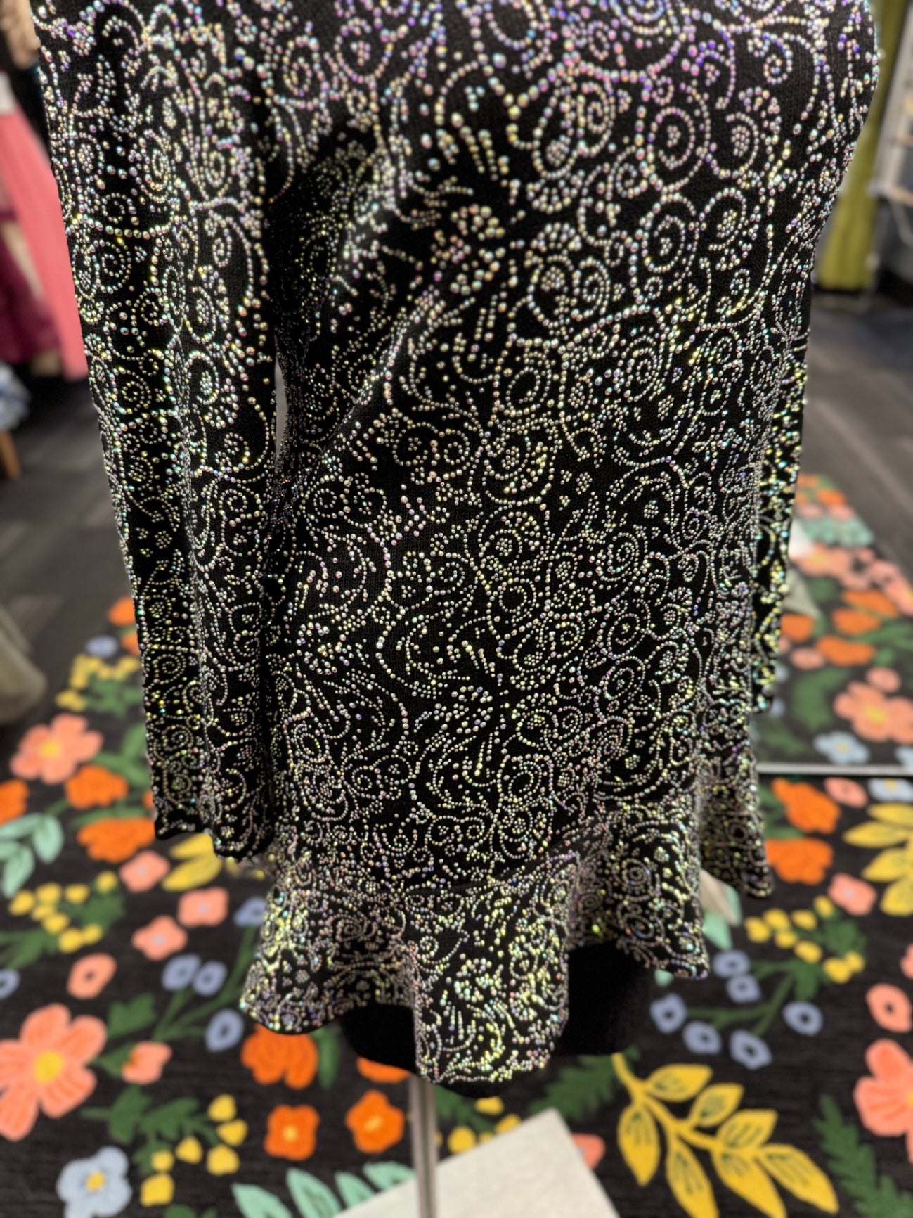 Elegant black dress adorned with intricate swirling rhinestone patterns. Features a round neckline and long sleeves, perfect for evening occasions. A stunning choice for formal events that require a touch of glamour. Its fitted silhouette complements and enhances the feminine figure. Suitable for parties, galas, or a night out. Adds sparkle and sophistication to any wardrobe.