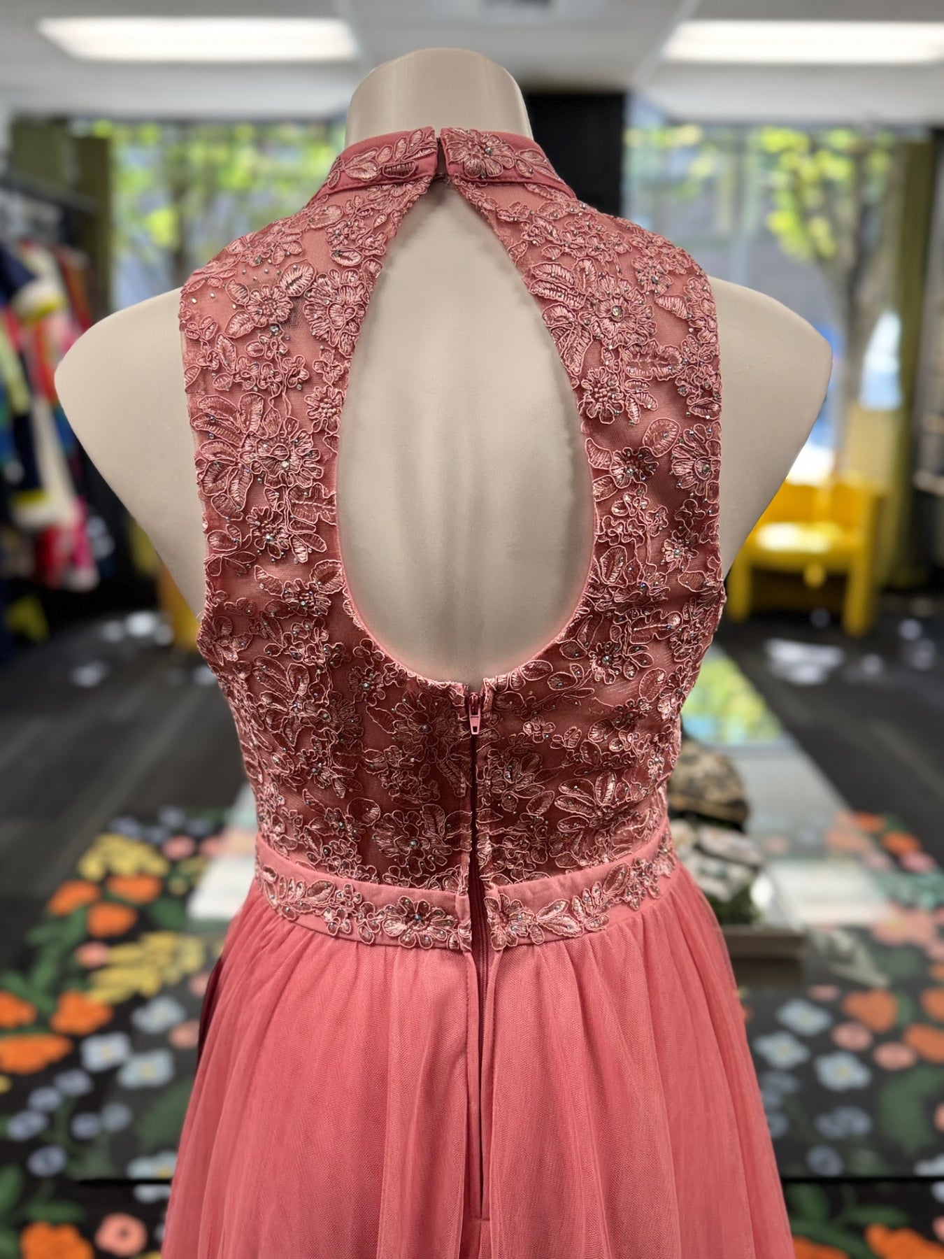 This stunning pink dress combines delicate lace on the bodice with a flowing tulle skirt, perfect for special occasions. Its intricate detailing adds a touch of elegance, making it a standout choice for formal events or celebrations. The high neckline and sleeveless design offer a sophisticated silhouette. Crafted for comfort and style, this dress captures a feminine charm that is both timeless and modern.