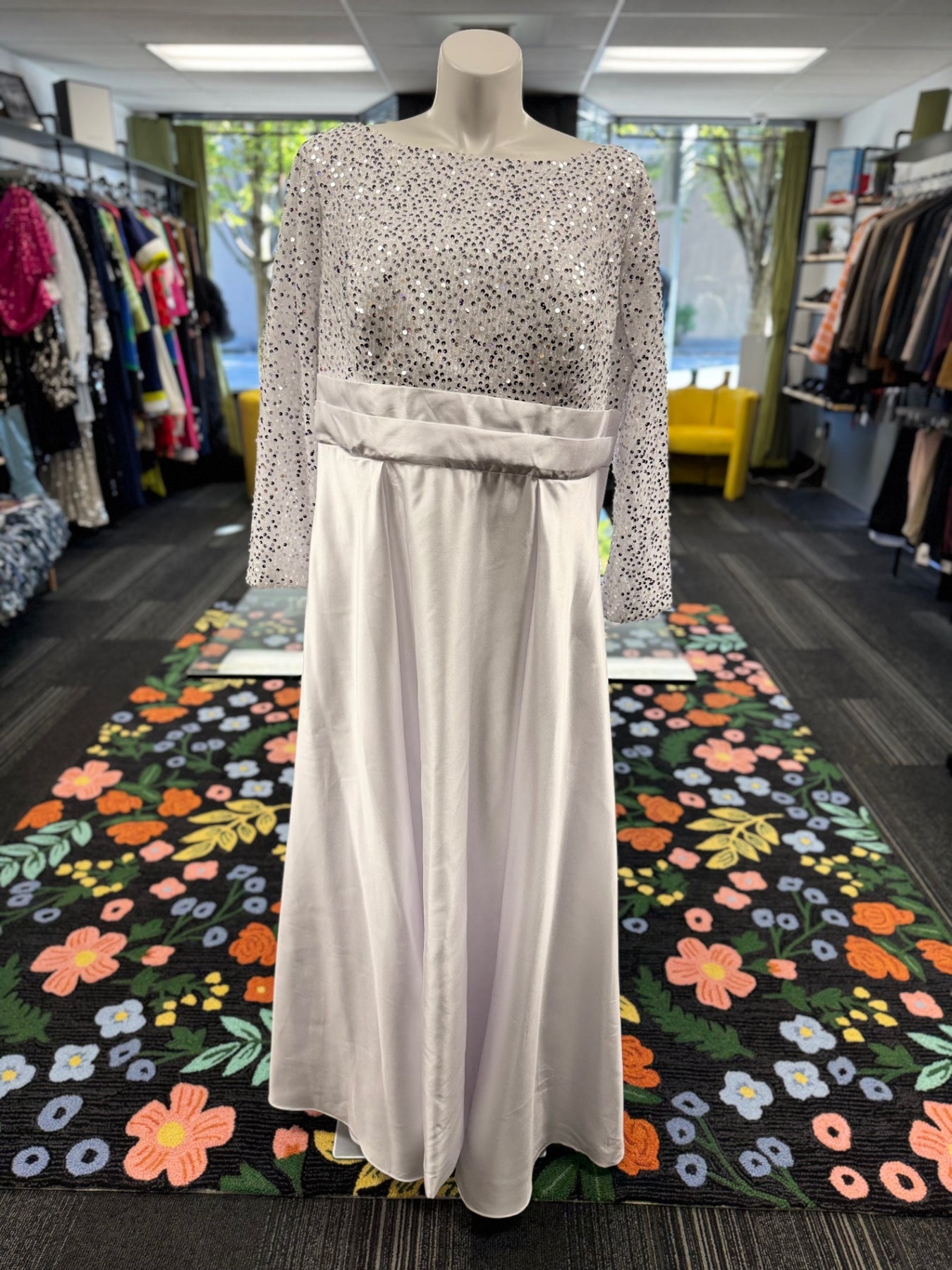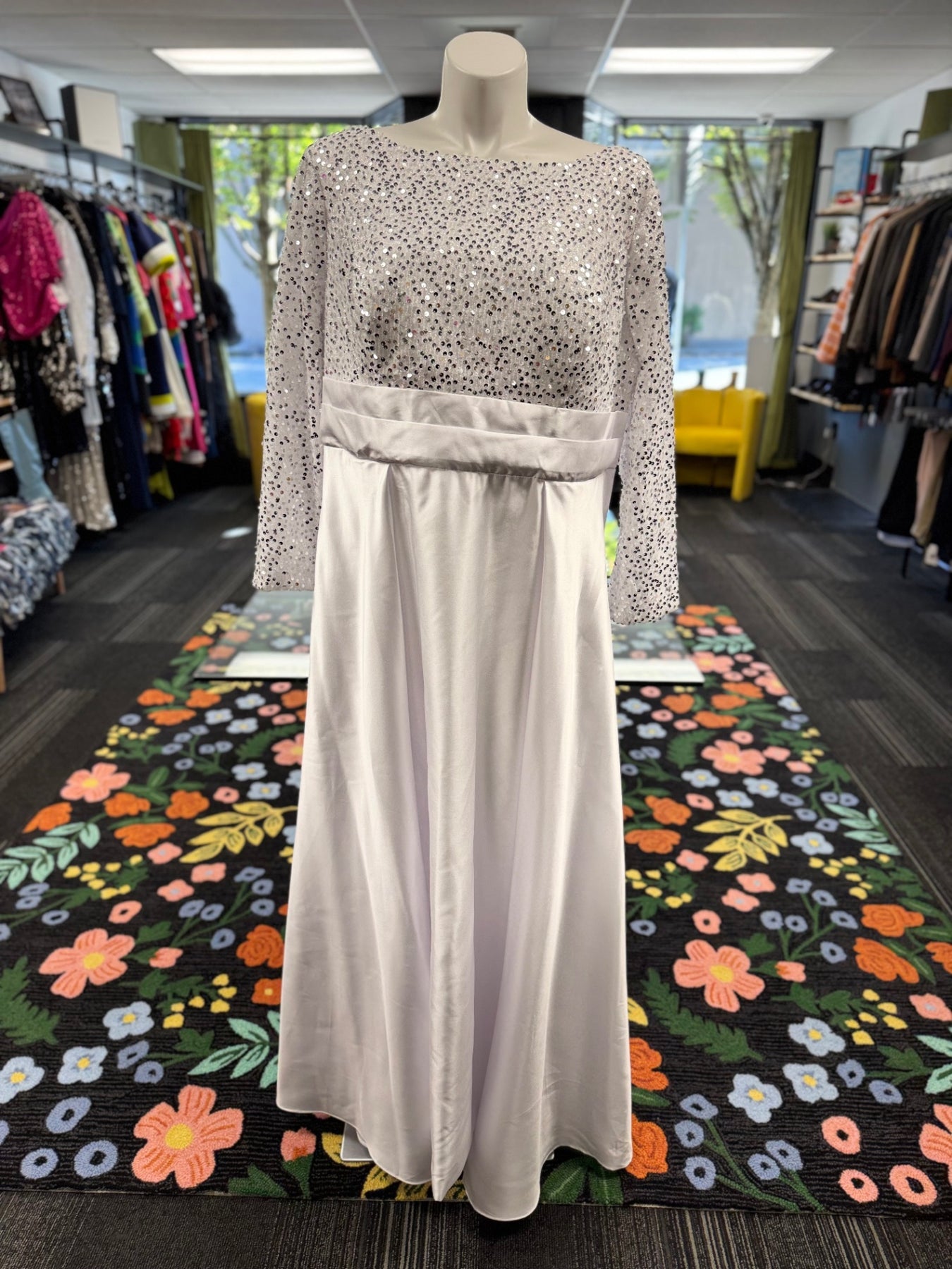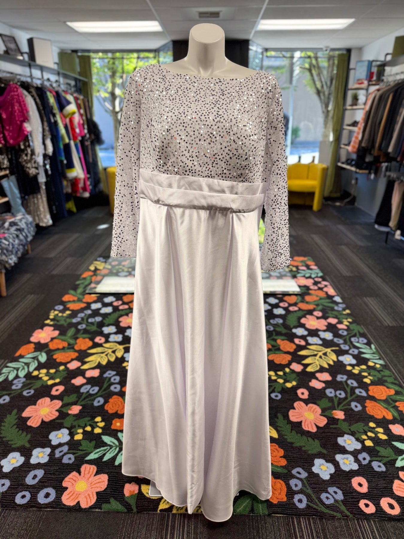 A stunning white dress featuring a top adorned with shimmering sequins that catch the light beautifully. The satin skirt flows effortlessly, adding a touch of elegance and sophistication. Perfect for special occasions or evening events, this dress blends glamour with timeless style.
