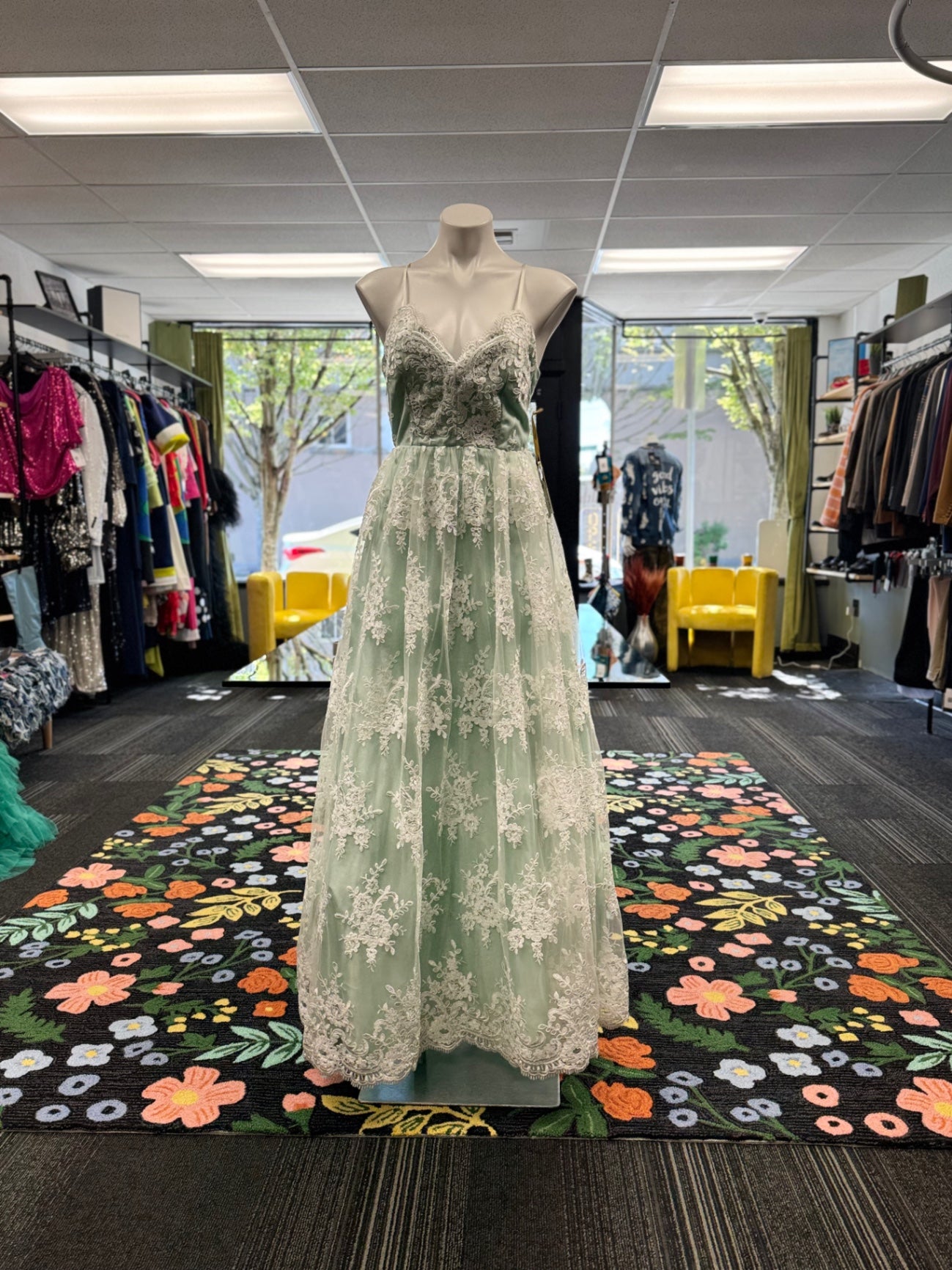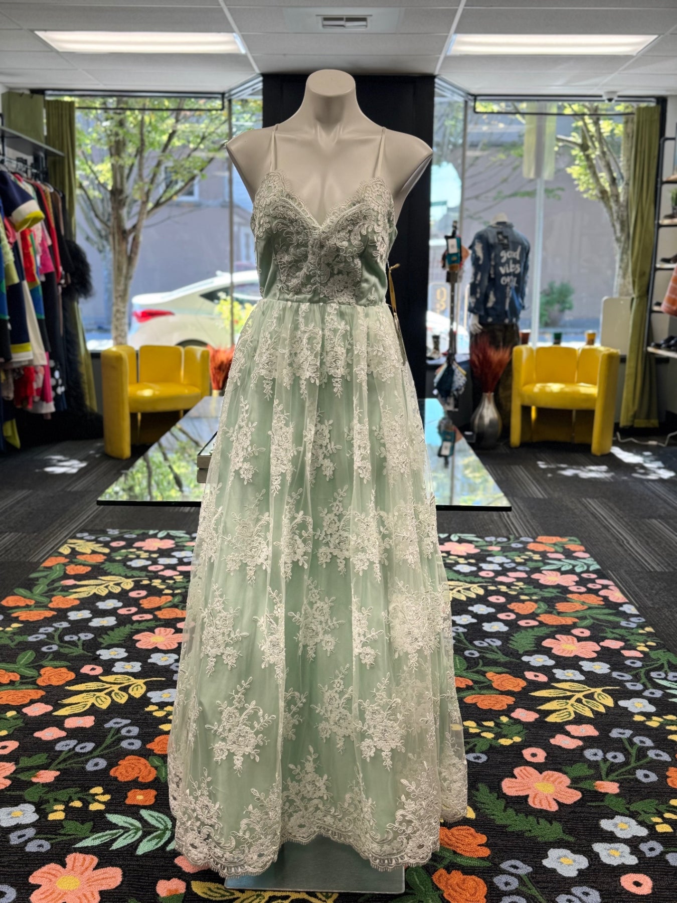 This elegant lace dress features intricate embroidery and a flowing silhouette, perfect for special occasions. With its delicate floral patterns and feminine design, it exudes a romantic and sophisticated vibe. The soft light green hue adds a fresh touch to the classic lace detailing, making it an eye-catching piece for spring or summer events.