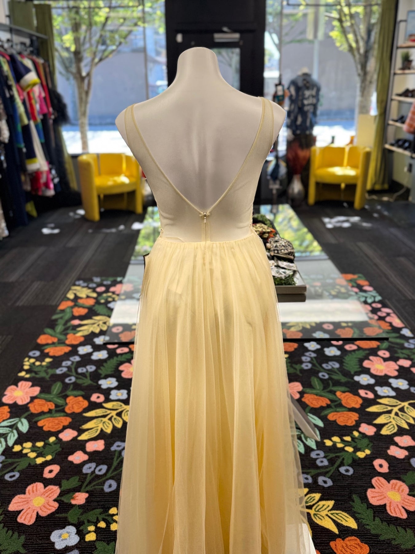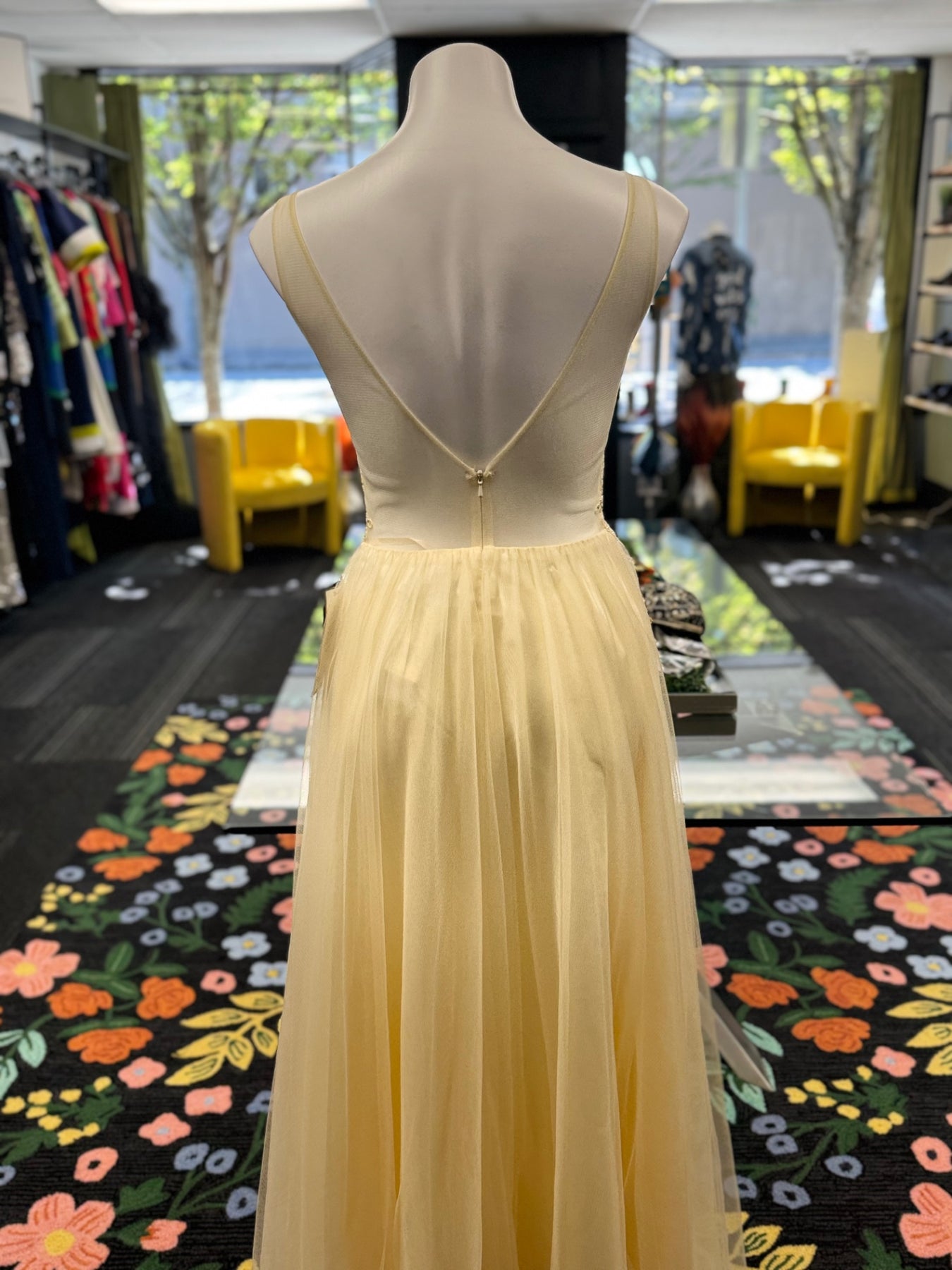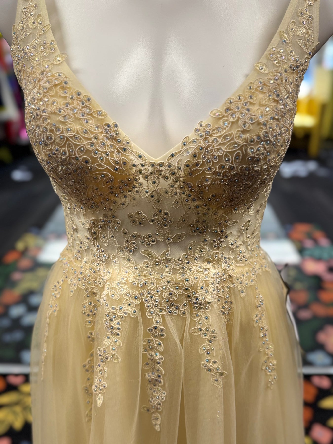 This elegant cream-colored dress combines delicate lace appliqué with flowing tulle fabric, perfect for formal occasions or special events. Its fitted bodice and flattering V-neckline offer a timeless silhouette, while the intricate detailing adds a touch of sophistication. Designed to make a memorable entrance, this dress balances classic charm with modern grace.