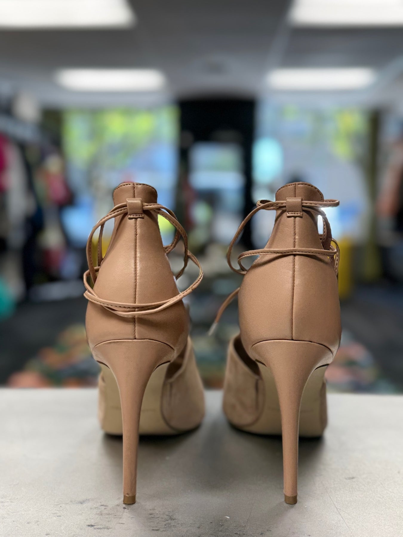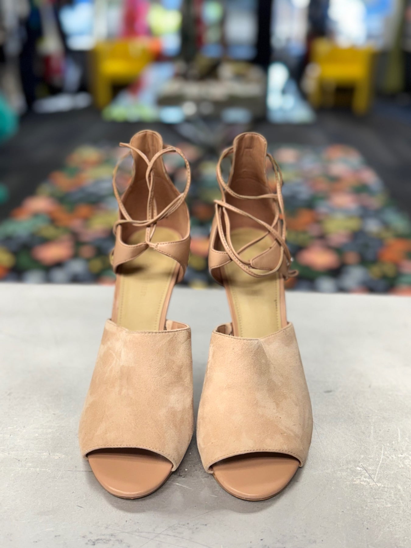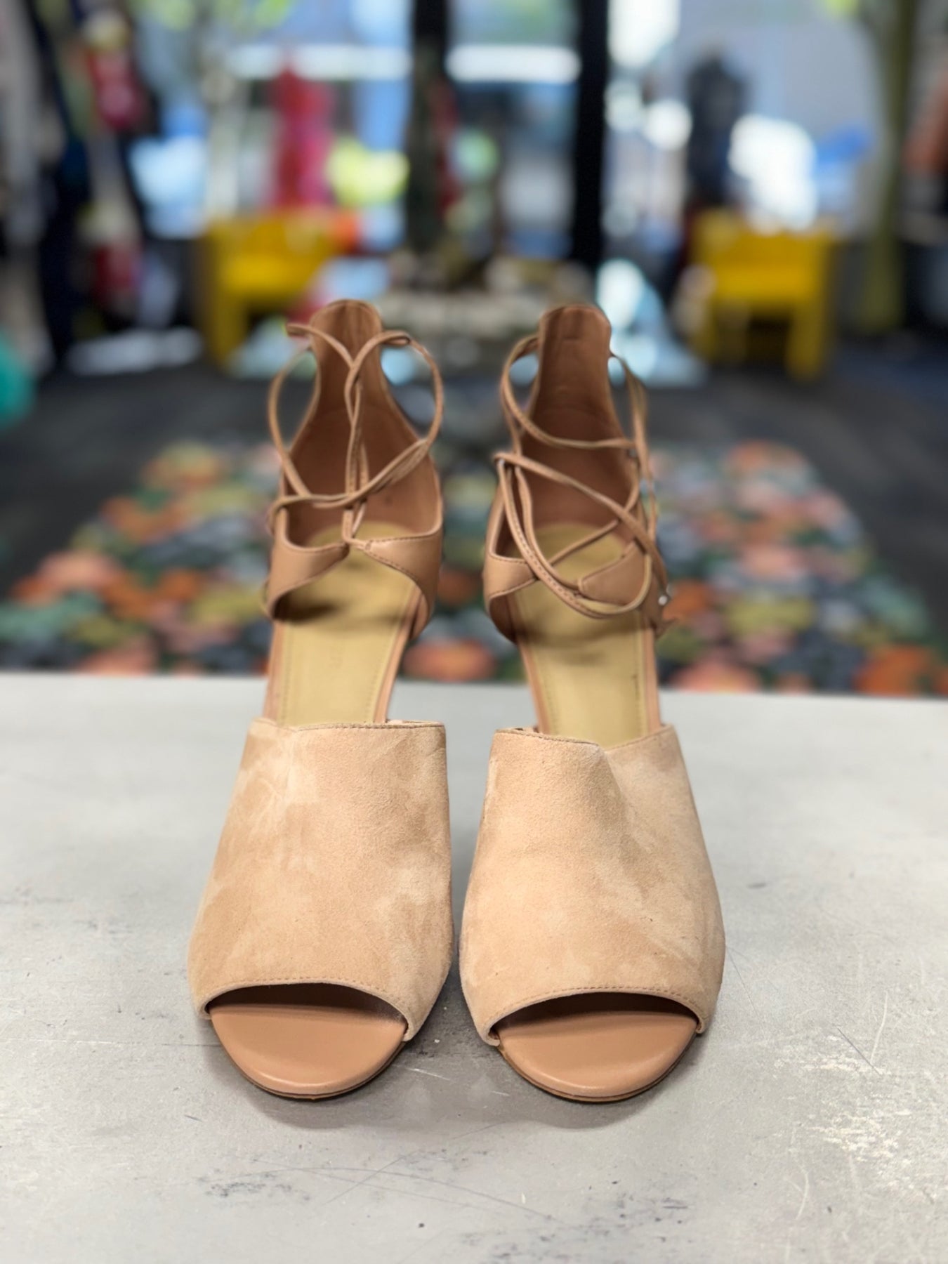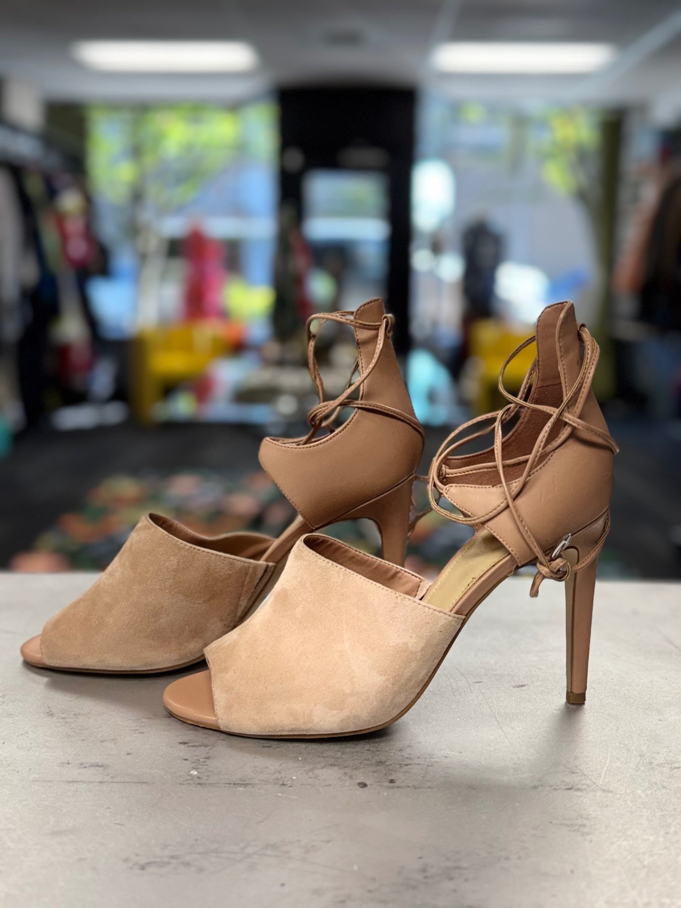 Chic beige women's open-toe heels with lace-up ankle straps. These stylish shoes combine a suede upper with smooth leather accents, perfect for both casual and dressy occasions. The block heel provides stability without sacrificing elegance. A versatile addition to your footwear collection, blending comfort and sophistication seamlessly.
