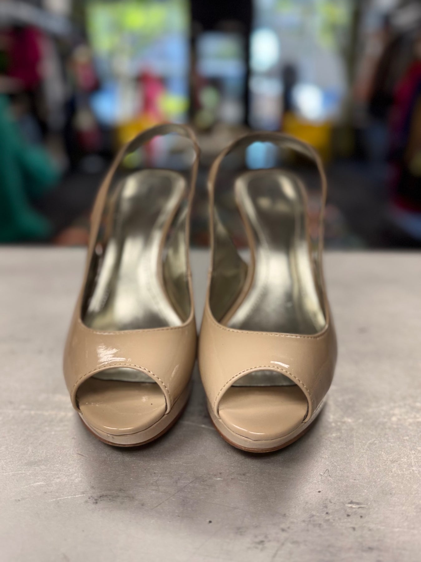 Step into elegance with these beige patent leather open-toe heels. Perfect for both casual outings and formal events, they add a chic touch to any outfit. The glossy finish gives them a timeless appeal, complemented by a sleek design that emphasizes comfort and style. These versatile shoes are a wardrobe essential for making a sophisticated statement.