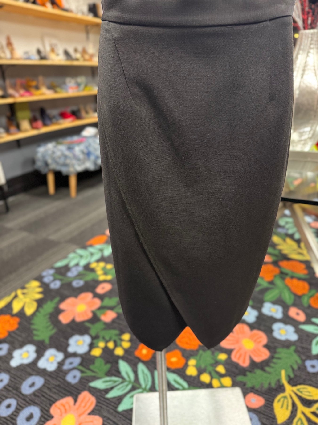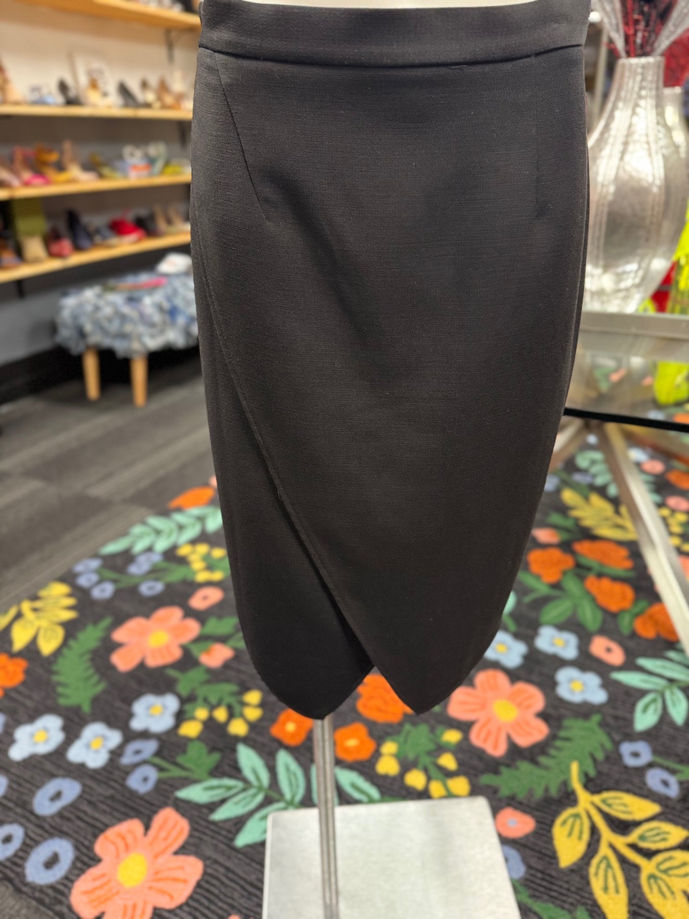 A sleek black skirt featuring a wrap-over design that adds a touch of elegance. The fabric appears smooth and slightly textured, perfect for professional or chic casual settings. Its tailored fit complements various body types, making it a versatile wardrobe staple. Whether styled with blouses or fitted tops, this skirt elevates everyday outfits with minimal effort.