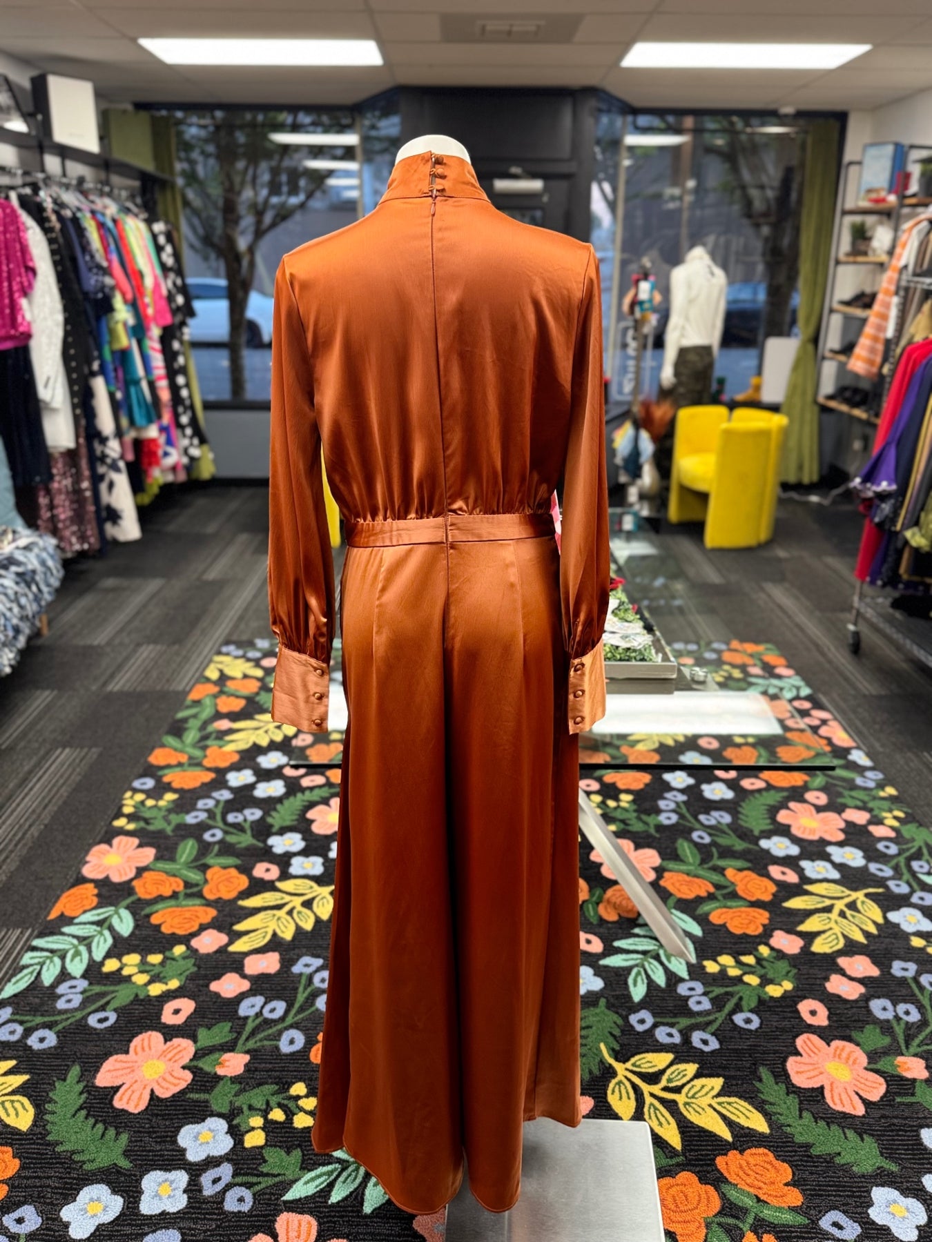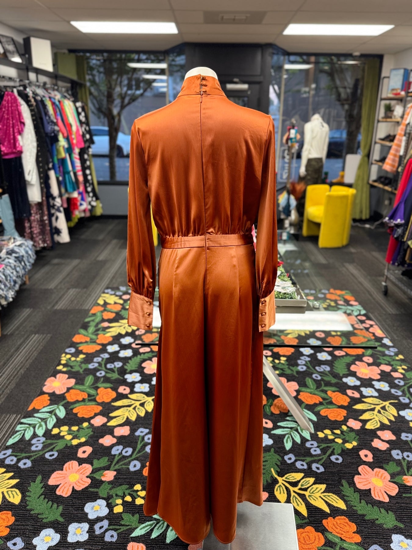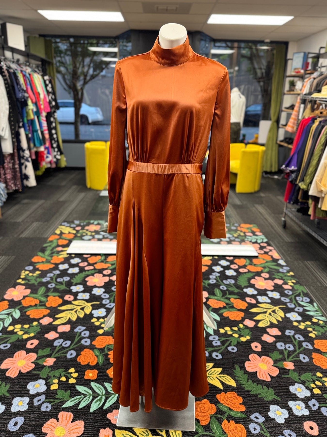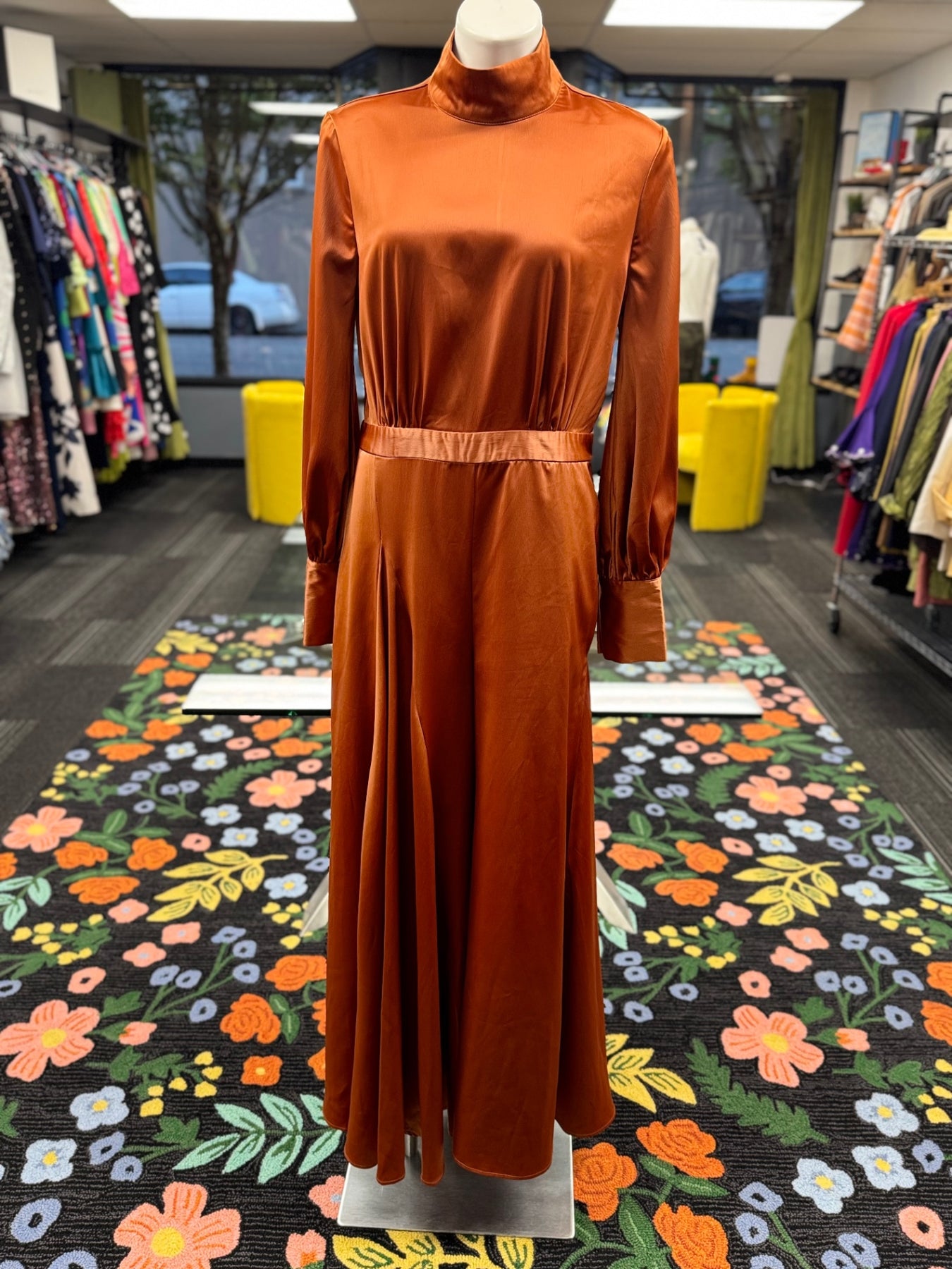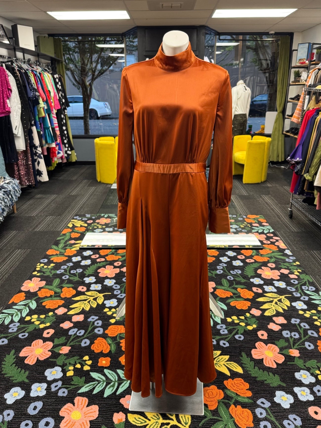 This elegant rust satin dress features a high neckline and long sleeves, perfect for making a sophisticated statement. Its lightweight fabric offers a smooth, shiny finish, elevating your evening wear. The dress's flowing silhouette is accentuated by subtle gathers at the waist, providing both comfort and style. Ideal for formal events or a chic night out, it combines timeless elegance with modern appeal. Versatile and eye-catching, this dress is a must-have for stylish wardrobes.
