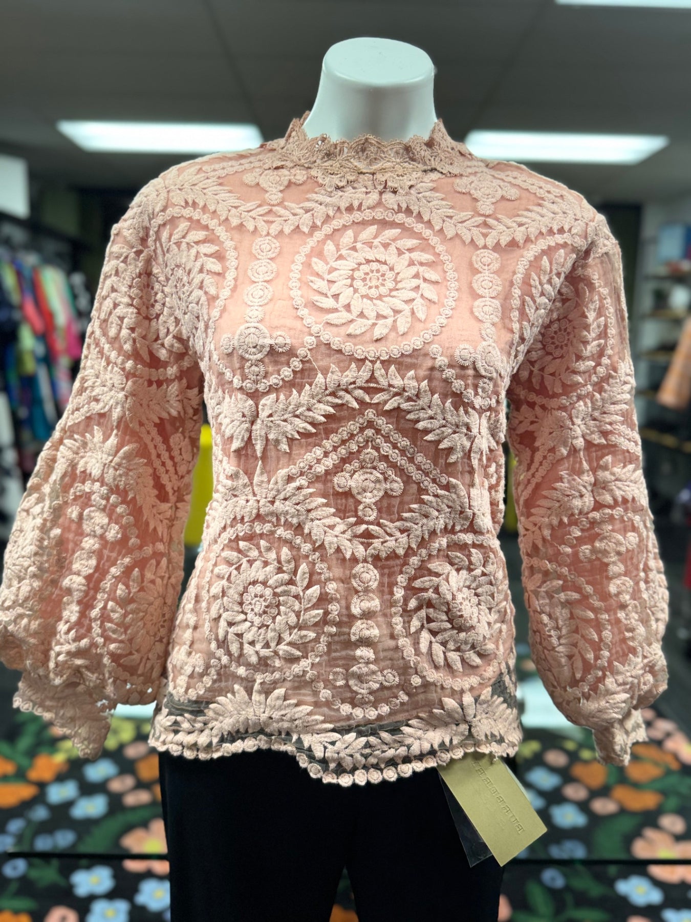 This peach lace blouse offers a sophisticated touch to any wardrobe. Its intricate embroidered floral patterns add texture and elegance, perfect for special occasions or a stylish day out. Crafted from delicate lace, it showcases a feminine silhouette with long sleeves and a scalloped neckline. Versatile for both daytime and evening looks, it pairs beautifully with tailored trousers or a sleek skirt. The craftsmanship highlights a vintage-inspired charm merged with contemporary delicacy.