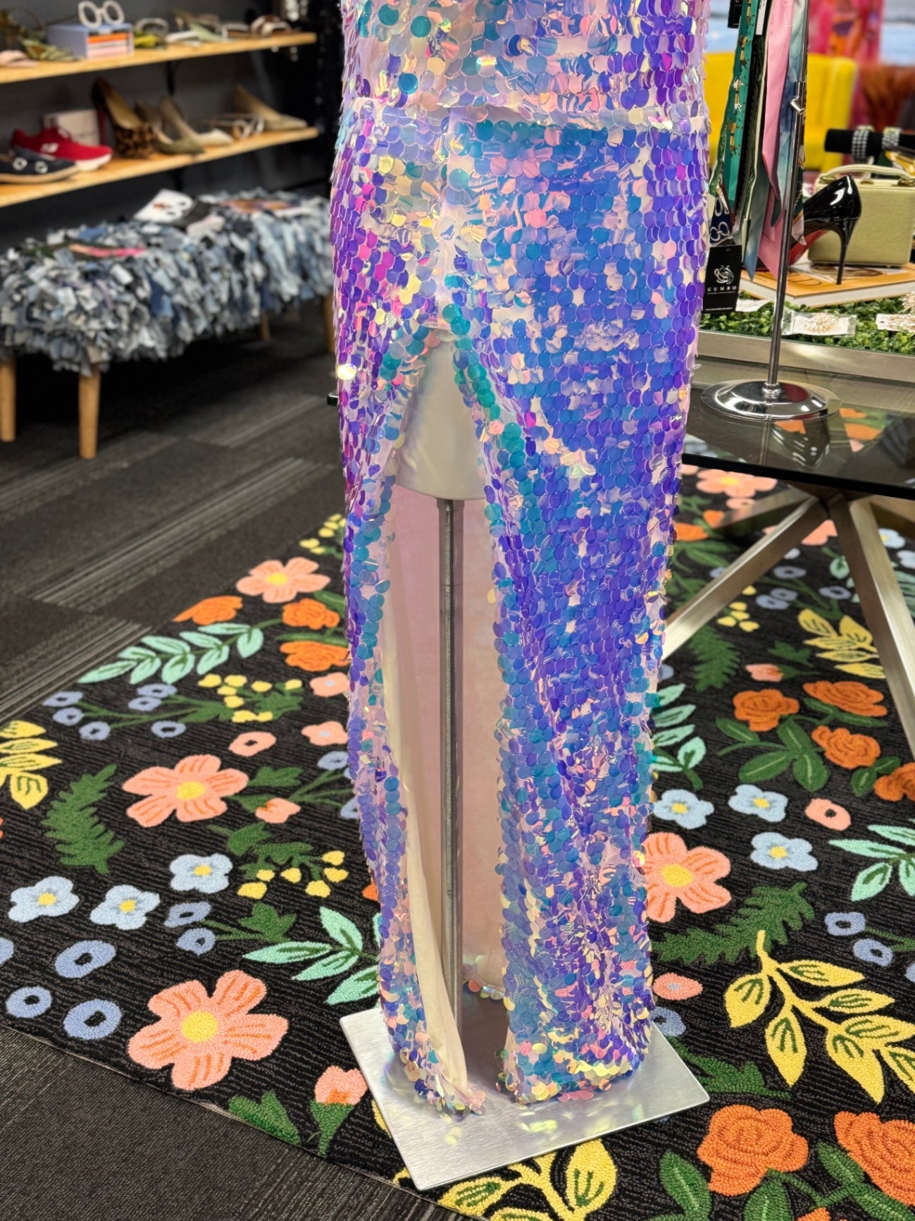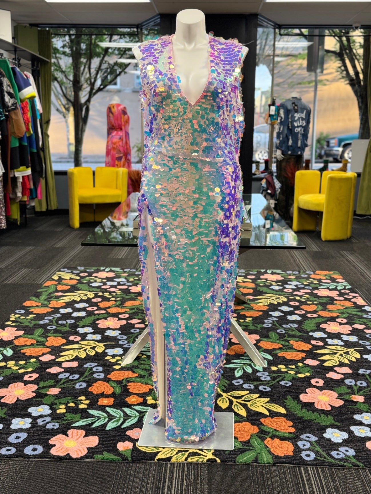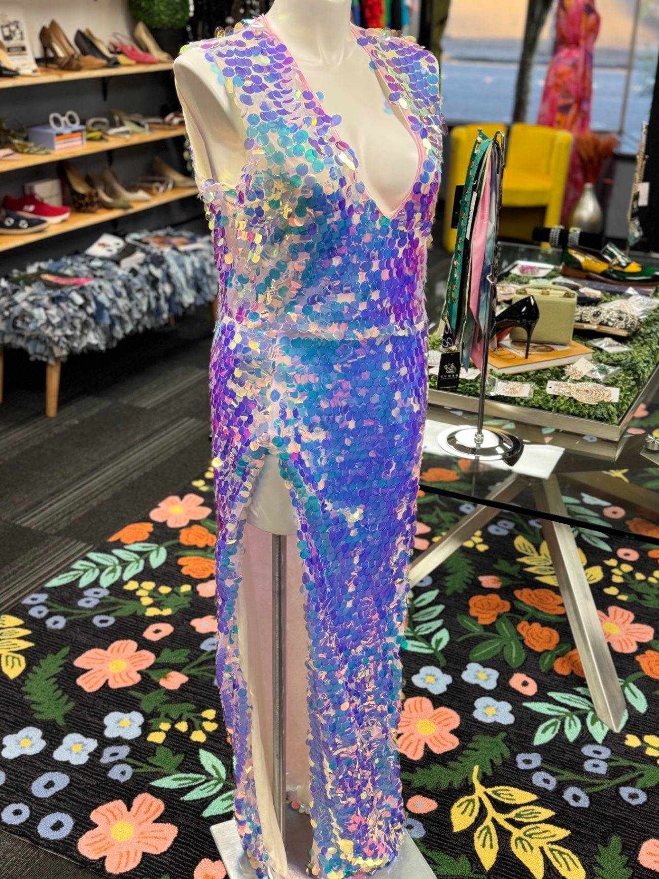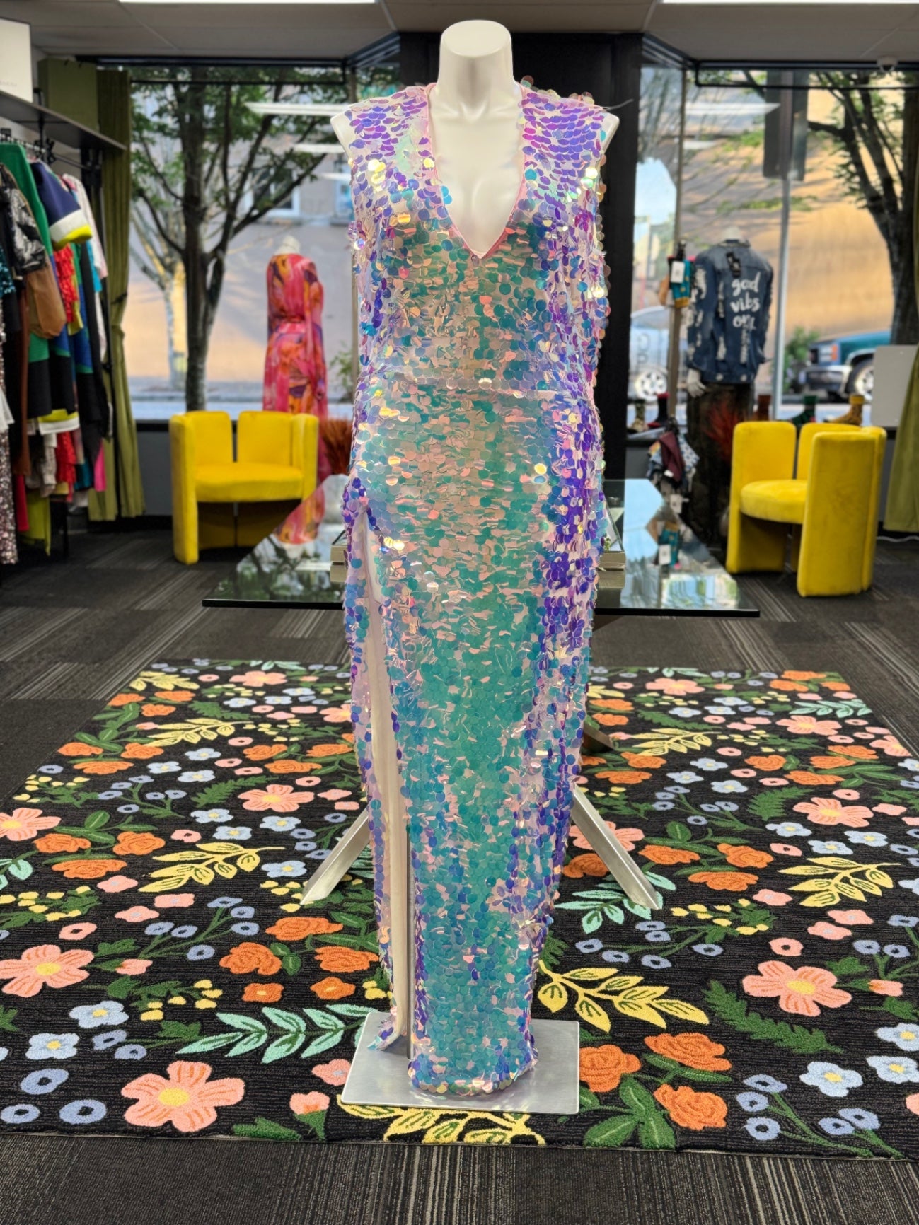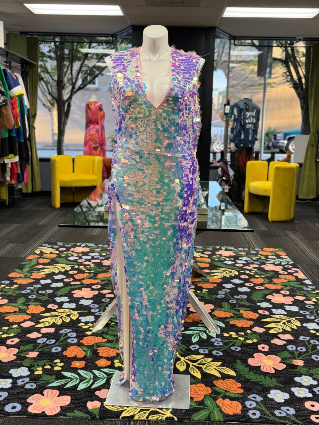 This eye-catching sequined dress features a mesmerizing array of pastel hues, creating a shimmering and glamorous look. Its sleeveless design and deep V neckline add a touch of elegance perfect for special occasions or festive nights out. The full-length style makes a bold statement, ensuring you'll stand out in any crowd. Crafted from high-quality sequins, this dress combines sparkle with comfort for memorable nights.
