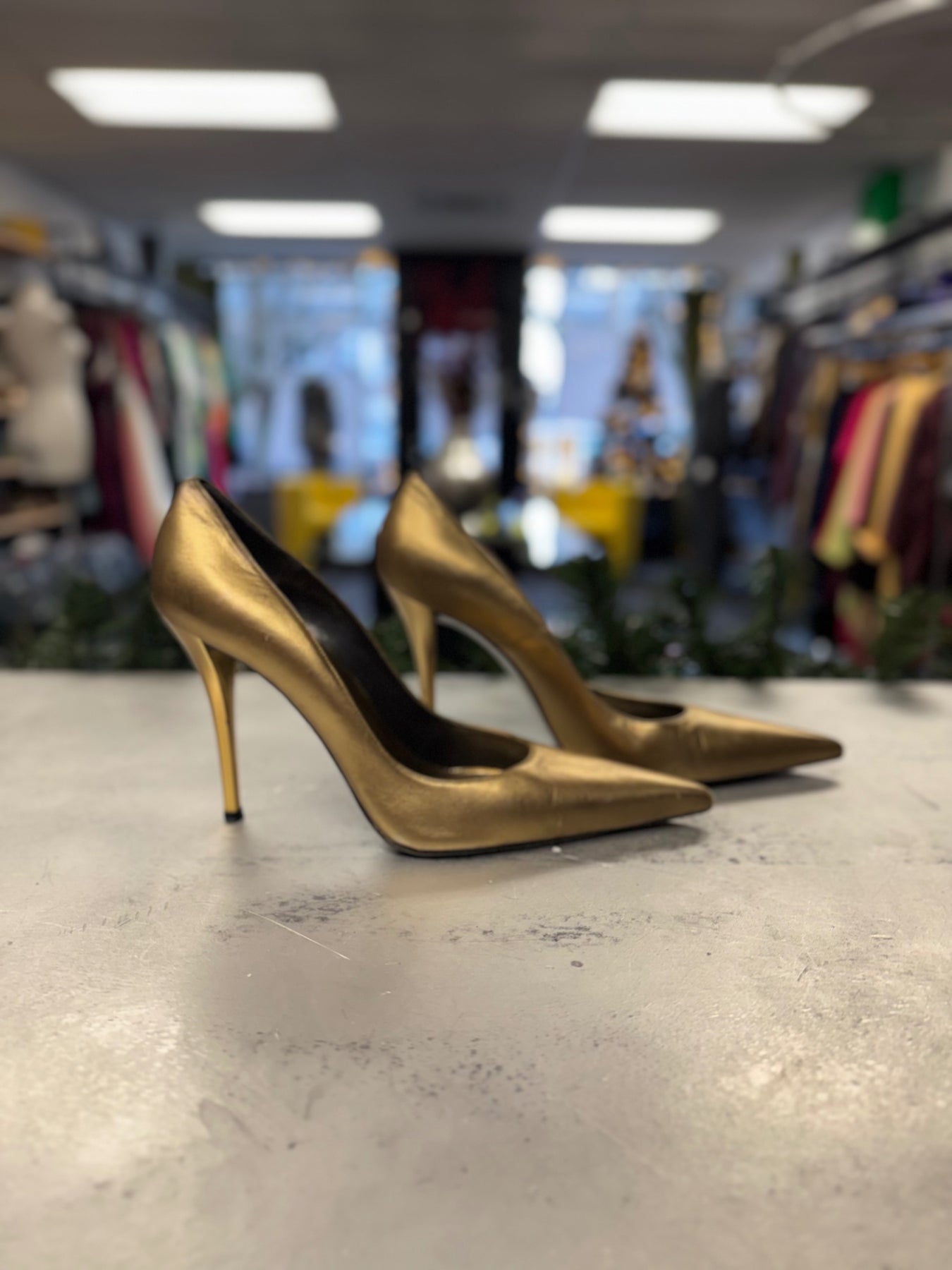 These stunning gold high heels feature a sleek pointed toe and a shiny finish that exudes elegance. Perfect for special occasions or adding a glamorous touch to your outfit, they combine classic style with a modern metallic twist. The pointed design elongates the legs, making them a chic choice for both formal and party wear.