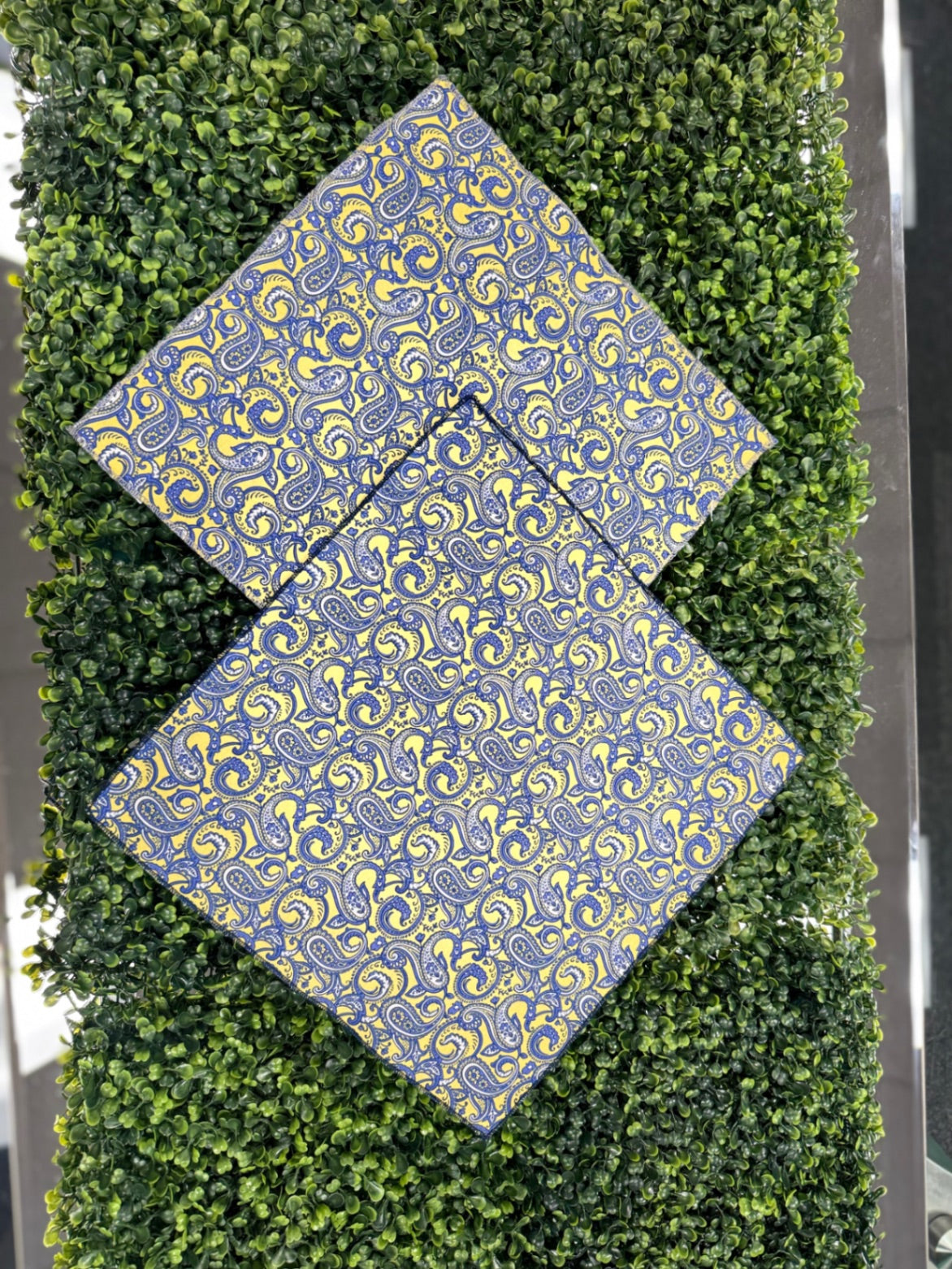 A vibrant silk pocket square featuring an intricate yellow and blue paisley pattern. Perfect for elevating formal and semi-formal outfits, this accessory adds a touch of elegance and personality to any blazer or suit jacket. Its luxurious fabric and detailed design make it a versatile choice for special occasions or upscale events.