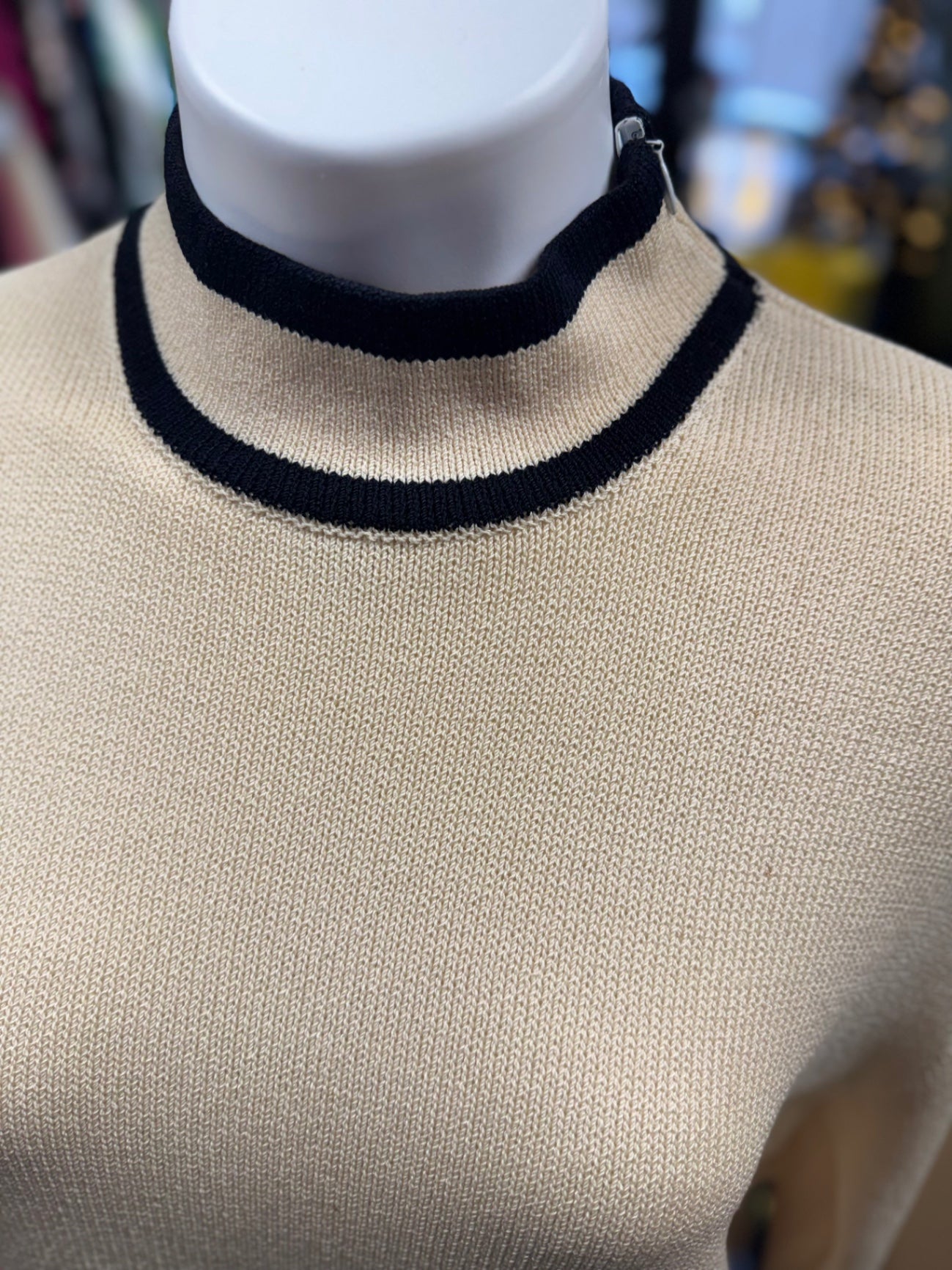 A chic, vintage-inspired cream sweater with bold black stripes on the turtleneck and cuffs. The relaxed fit makes it perfect for layering over your favorite jeans or skirts. Its soft knit fabric ensures comfort throughout the day. Stylish yet versatile, this piece can elevate both casual and semi-formal outfits.