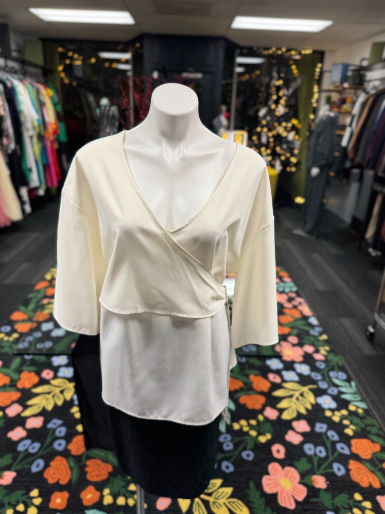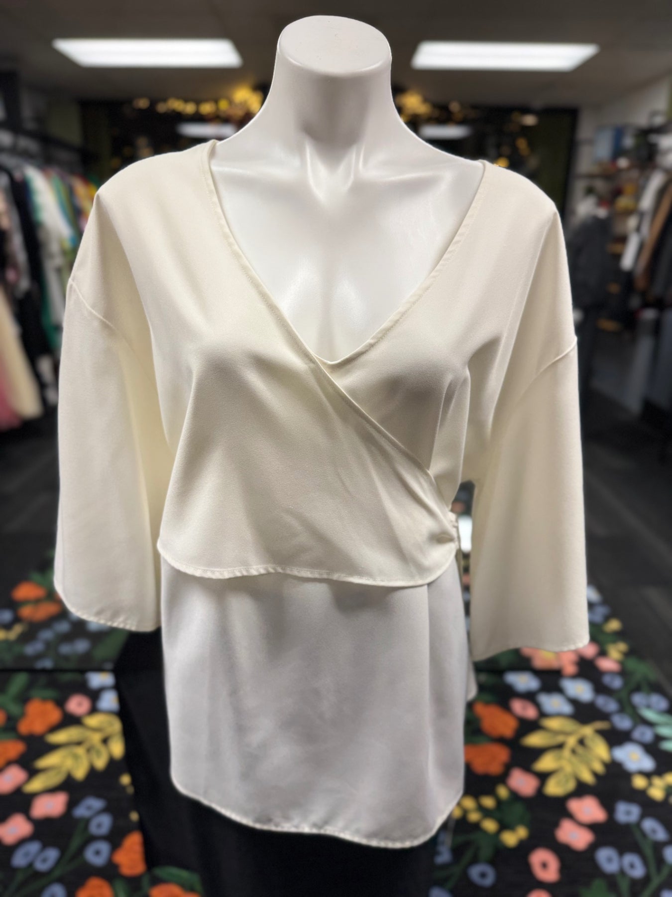 This elegant cream silk top features a unique wrap design with a V-neckline, perfect for dressy or casual occasions. Its soft, luxurious fabric drapes beautifully, offering both comfort and style. The loose fit and three-quarter sleeves make it a versatile addition to any wardrobe. Ideal for pairing with trousers or skirts for a sophisticated look.